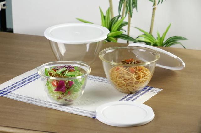 フタをしたまま電子レンジで使える、ガラス製のボウルセットです。作り置きした料理やボウルで混ぜた食材をそのまま加熱できるので、下ごしらえや様々な調理に活躍します。ラップを使わずにすむのでエコで経済的なのも嬉しいポイントです。