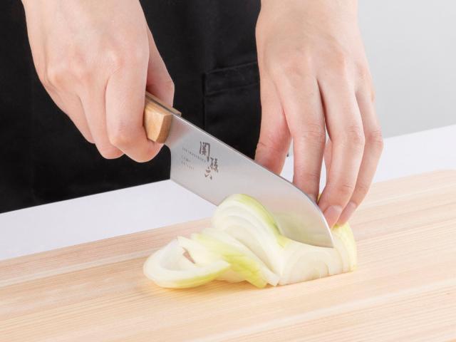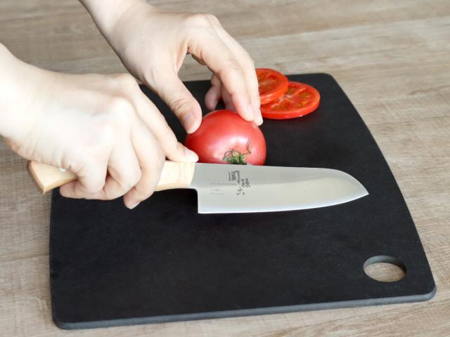 お肉やお魚、野菜など、幅広い食材に対応でき、一般的な三徳包丁よりも小さめな、刃渡り14.5cmサイズなので手の小さい女性の方や一人暮らしのキッチンにもおすすめです。