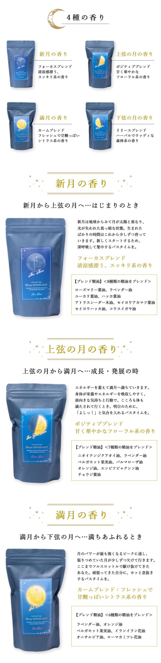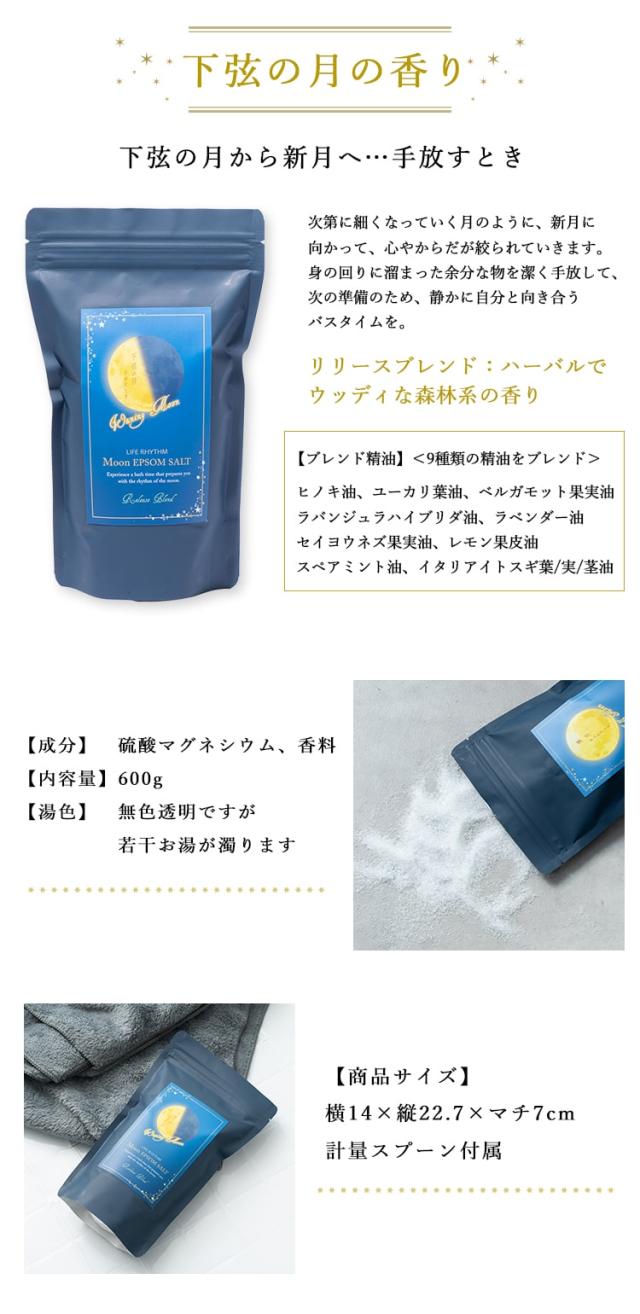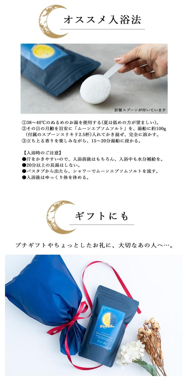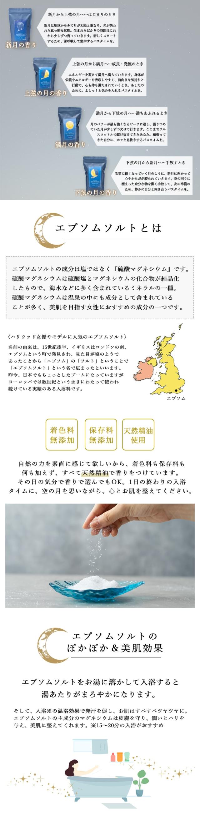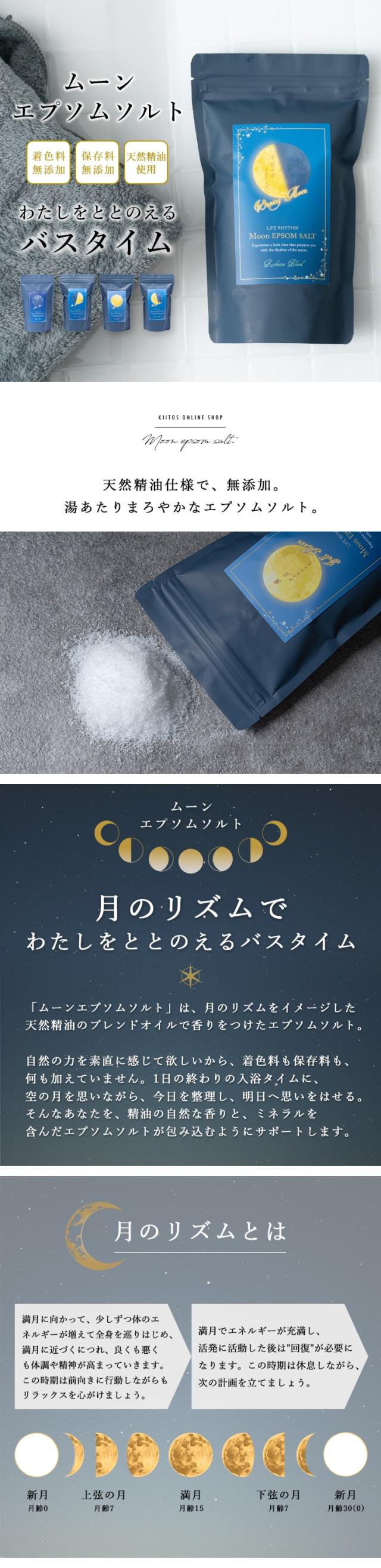 「ムーンエプソムソルト」は、月のリズムをイメージした天然精油のブレンドオイルで香りをつけたエプソムソルト。