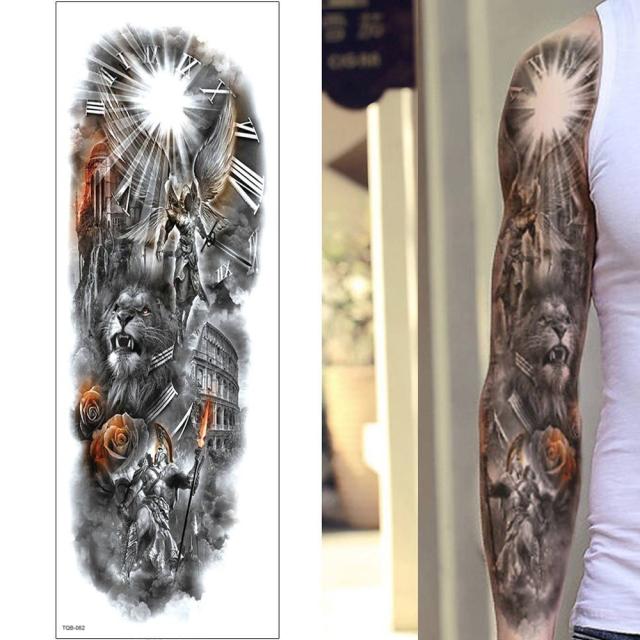 長いロングタイプの腕から手首までや太ももから膝下までにぴったりのローマ数字や剣をもった天使やライオン、古代ローマのコロッセオ、戦士、薔薇の花をデザインした水で貼るフェイクタトゥ—ステッカー。