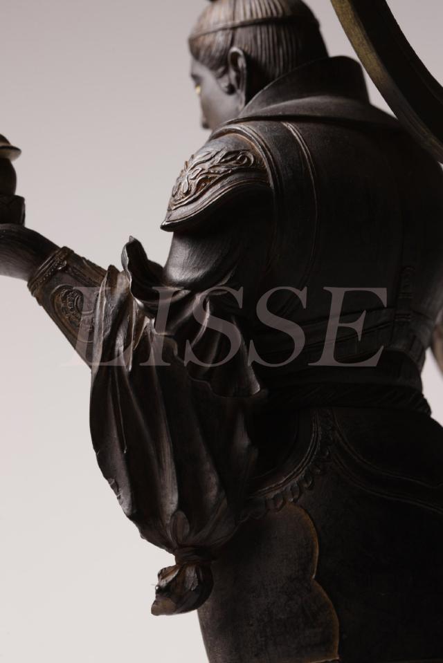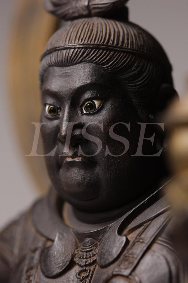 イスムでは実物の持つ質感と量感を徹底検証して造り上げました。玉眼の輝きは6回に分けて彩色を施し、その力強い眼力を再現、黒光りする胴体と爛々と輝く眼の強い対比が強い印象を与えます。丁寧な研磨と彩色によって再現する、年月を経た漆の持つ美しい古色にこだわっています。