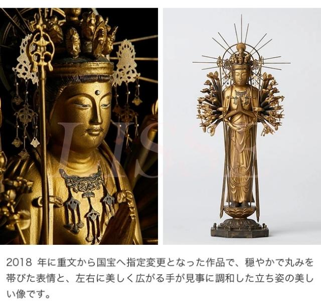 モデルは京都の重文「千体千手観音立像」。運慶の実子 湛慶(たんけい)の銘を持つ一体で、平安様式を踏襲しながらも、鎌倉彫刻の張りのある造形が特徴です。穏やかで丸みを帯びた表情と、42本の手が見事に調和した立ち姿の美しい像です。