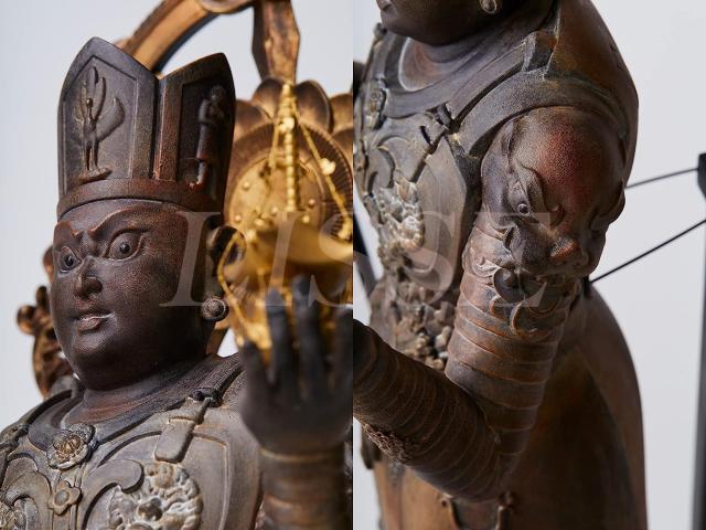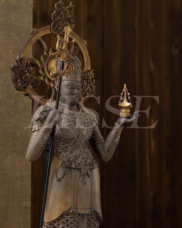 モデルは東寺 宝物館に所蔵される国宝「木造兜跋毘沙門天立像」。平安京の正面にあった羅城門の楼上に安置されていたと伝わるこの像は、異国情緒漂う造形美が特徴で、多くの模刻像が京都や奈良を中心に残されています。