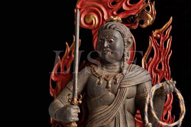 モデルは鎌倉時代の名仏師・快慶が1203(建仁三)年に造像した重文「(木造)不動明王坐像」。表情や体躯を誇張しすぎない写実的な表現が特徴で、繊細で優雅な如来や観音像を得意とした快慶らしく、端正で理知的な姿に仕上げられています。