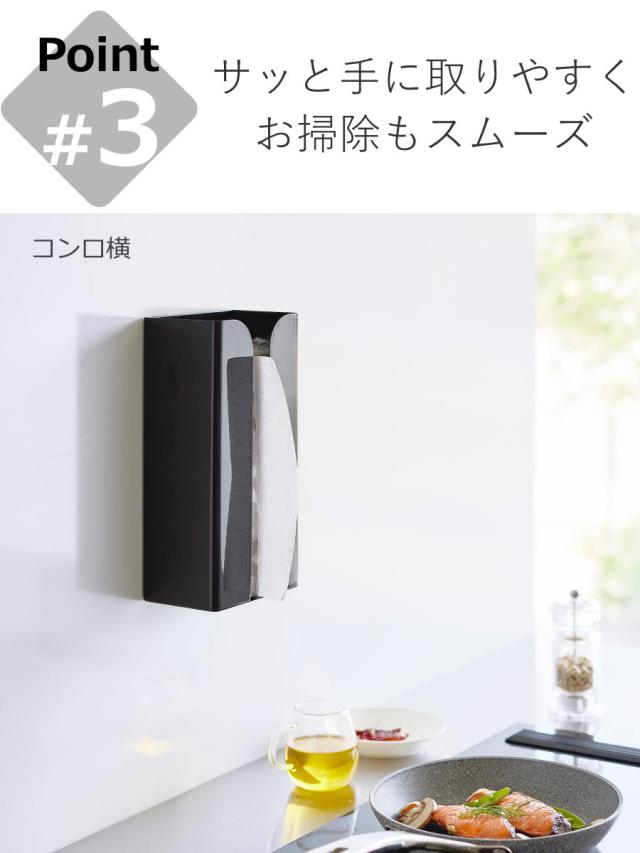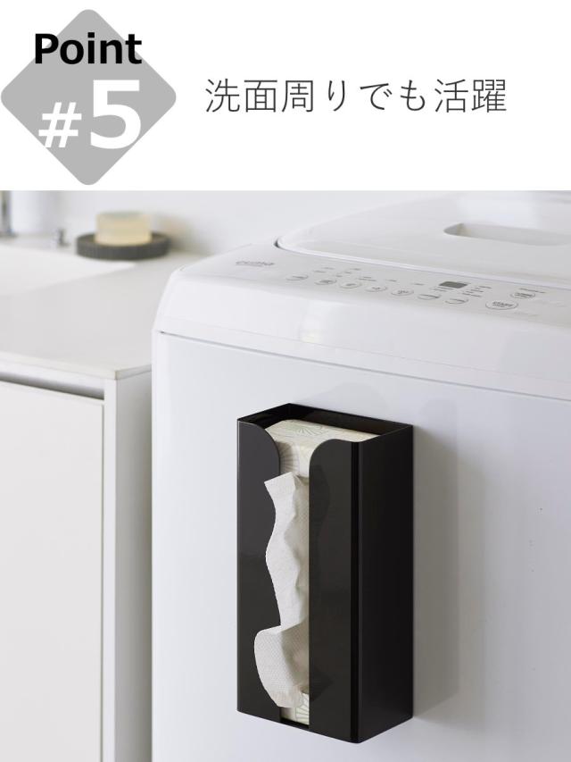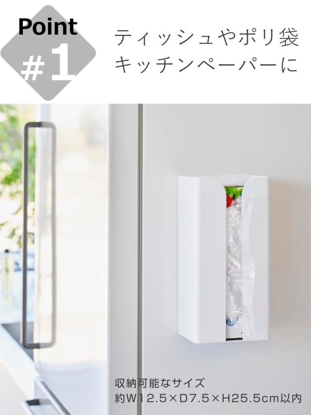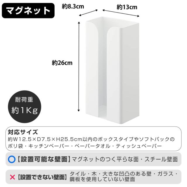 | 備考 | 【対応サイズ】 約幅12.5×奥行7.5×高さ25.5cm以内のボックスタイプやソフトパックのポリ袋・キッチンペーパー・ペーパータオル・ティッシュペーパー 【取り付け可能な壁面】 マグネットがつく平らな面・スチール壁面 |