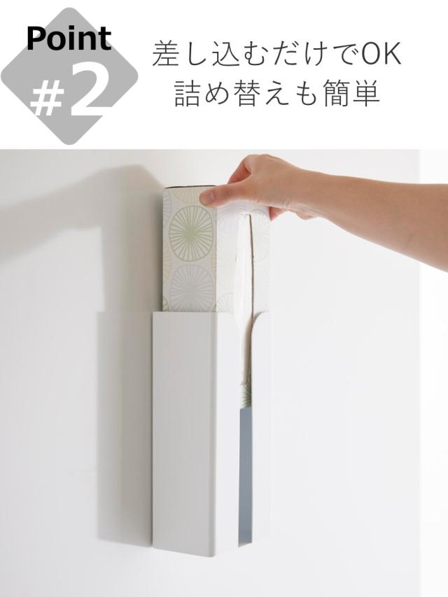 マグネットが使える壁に取り付けできるボックスホルダーです。ボックスタイプやソフトパックのポリ袋・キッチンペーパー・ペーパータオル・ティッシュペーパーを収納できます。