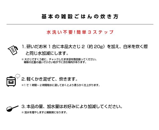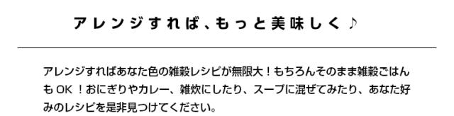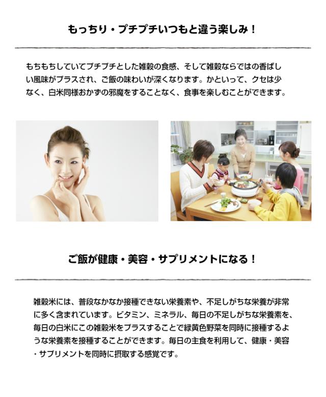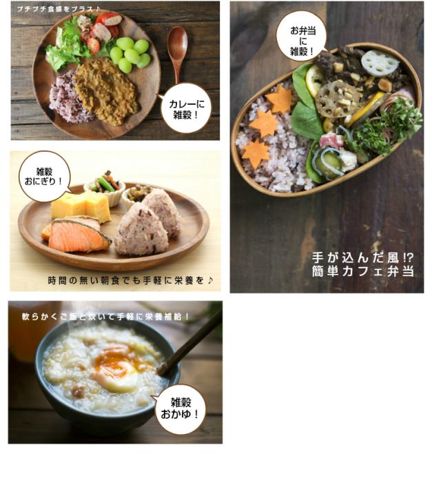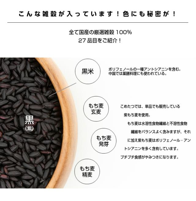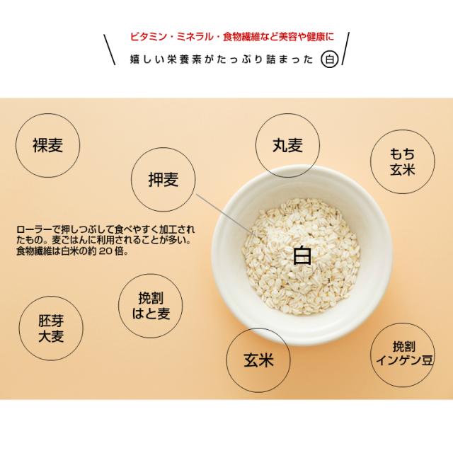 胚芽大麦、押麦、丸麦、裸麦、もち麦玄麦、もち麦精麦、もち麦発芽、青玄米、青発芽米、青もち玄米、玄米、もち玄米、黒米、赤米、小豆(挽割)、大豆(挽割)、もちび、青大豆(挽割)、インゲン豆(挽割)、うるちきび、黒大豆(挽割)、はと麦(挽割)、とうもろこし(挽割)、うずら豆(挽割)、大正金時豆(挽割)、もち粟、えんどう豆(挽割)