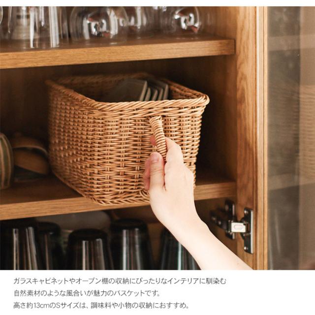 ガラスキャビネットやオープン棚の収納にぴったりなインテリアに馴染む自然素材のような風合いが魅力のバスケットです。