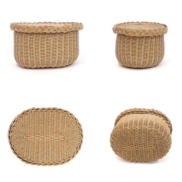 自然な温かみのあるPPラタンで編み上げたオーバル型のバスケット。フタ付きなので散らかりがちな物の目隠し収納にぴったり。縁取りがポイントになったフタは裏返してトレイとしても使えます。