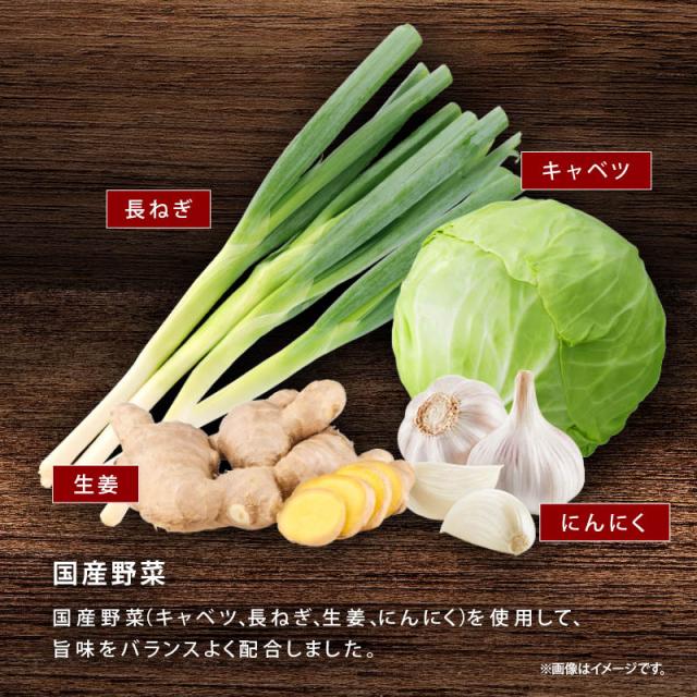 ◆原材料:鶏肉(国産)、キャベツ(国産)、長ねぎ(国産)、生姜(国産)、ホタテエキス(国産ホタテ使用・国内製造)、にんにく(国産)、(一部に鶏肉を含む)