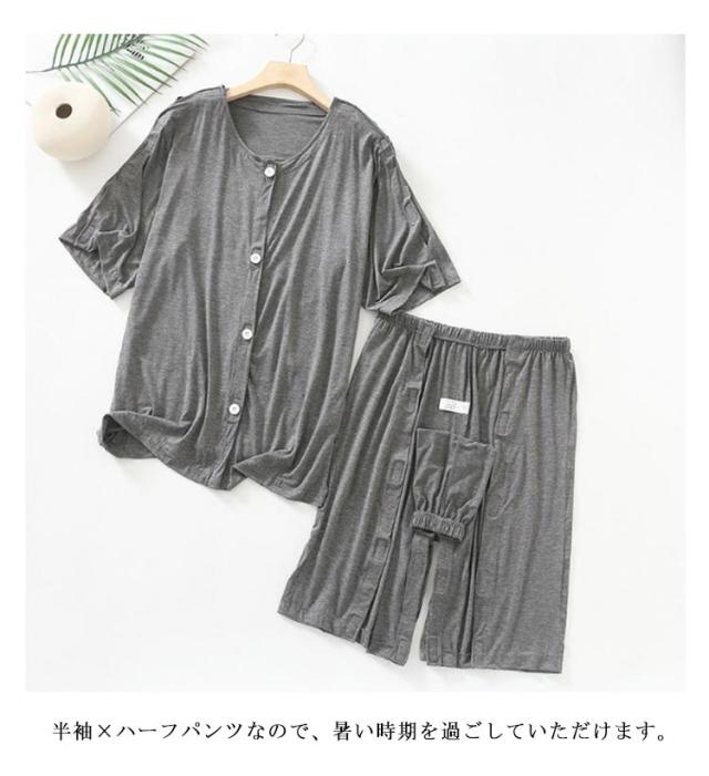 | 見た目は普通なタイプですが、便利な全開パジャマ。点滴、検温や着替え時の開閉が簡単する。 要介助者に安心です。 着替えが困難な方をサポート、オムツ替えはもちろん入浴後の着替えもこのパジャマなら安心、快適です。 半袖×ハーフパンツなので、暑い時期を過ごしていただけます。 病院、老人ホームなどで場所の使用に最適! 心地よくモダール素材を使用、ムレずにサラサラな寝心地を実現、快眠をサポートします。 | |