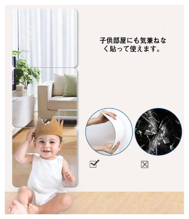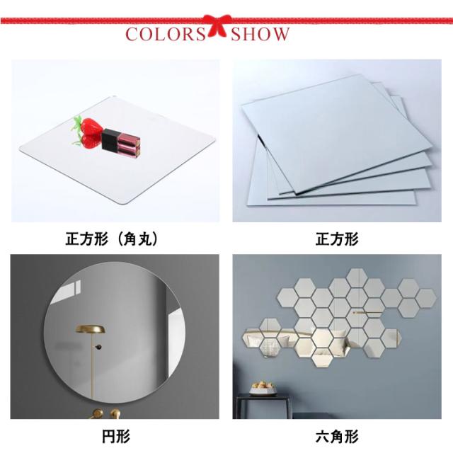 | アクリル製壁に貼るタイプの割れない鏡。【30×30cm?4枚セット】【正方形?円形?六角形】 万が一はがれて落ちても、ガラスのように砕ける事もナシ! 子供部屋にも気兼ねなく貼って使えます。 壁に穴を開ける必要もないので、賃貸住宅でもお使い頂けます。 裏面は粘着面になっているのでテープや接着剤も必要ありません。 滑らかな壁、ラテックスの壁、ガラスの壁や木製ドアに設置OK。 スタンドのない壁に貼るタイプの鏡は壁と一体になり場所をとらないのでとても省スペースでお部屋を広々使うことができます。 玄関、寝室、廊下、バスルームなど、部屋内に様々なところでお使い頂けます。毎日お出掛けにする時の身だしなみチェックも楽しむことができます。 | |