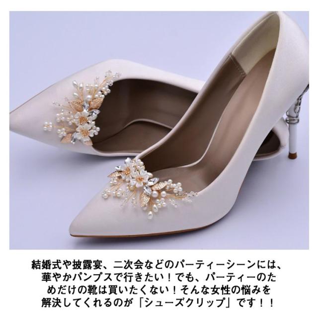 | シンプルなパンプスもパーティー仕様に早変わり!【2個1組】 結婚式や披露宴、二次会などのパーティーシーンには、華やかパンプスで行きたい!でも、パーティーのためだけの靴は買いたくない!そんな女性の悩みを解決してくれるのが「シューズクリップ」です!! お手持ちのシンプルなパンプスや飽きてしまったパンプスも、一瞬でパーティー用の華やかシューズに変身させてくれます。 ぱちんとワンタッチで取り付けられるクリップタイプだから、好きな場所に挟むだけでOK! パンプスやハイヒールはもちろん、手袋や帽子、バッグなどにワンポイントとして付けたり、ヘアゴムに付ければヘアアクセサリーとしても楽しめます♪ ビジューがキラキラ眩しい華やかさ満点のシュークリップはパーティーの主役級の輝き! | |