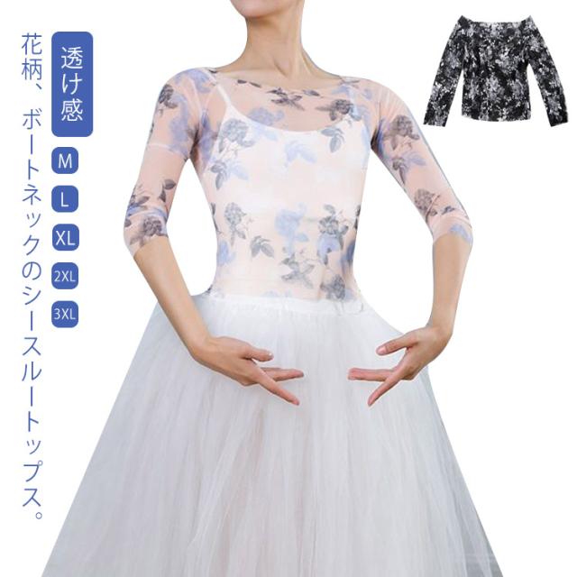 バレエ トップス 大人 花柄 ボートネック メッシュ バレエトップス レディース シアートップス 七分袖 シースルー トップス 透け感 ダンス レッスン 練習着 ストレッチ ダンス衣装 レイヤードトップス メロウ 20代 30代 40代