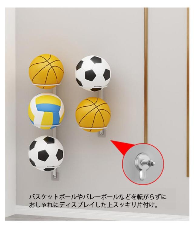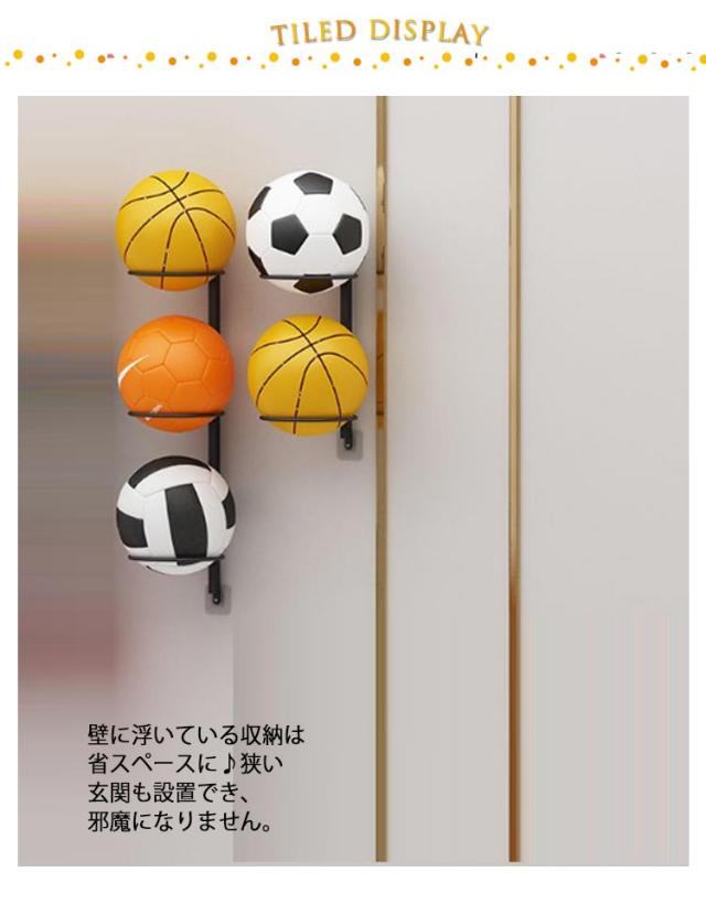 | トレンドの浮かせ収納ができる壁掛けボール収納ラック。 壁に浮いている収納は省スペースに♪狭い玄関も設置でき、邪魔になりません。 バスケットボールやバレーボールなどを転がらずにおしゃれにディスプレイした上スッキリ片付け。 粘着フック付属で穴あけ不要!マンションや賃貸もOK♪ ボールのほかに、ヘルメットを収納するのにも便利です。 | |