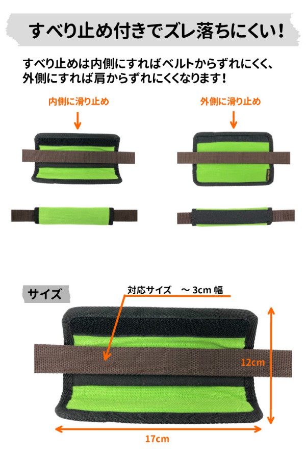 滑り止めが付いているのでずれにくく、取り外しができないタイプのショルダーベルトでも取り付けできます。