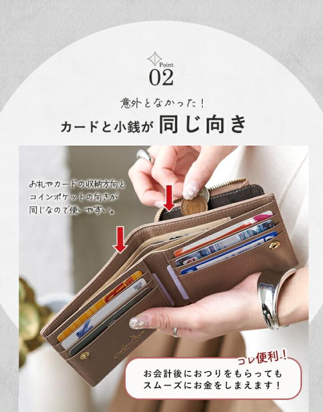 | 仕様 | 本体開閉:スナップボタン 小銭入れ:L字ファスナー 内側:フリーポケット×1、カード入れ×8 外側:小銭入れ×1、カード入れ×2 | |||||
