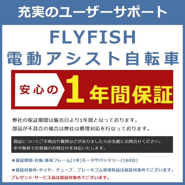- 一般保証について配達日を含め、車体1年、モーター・バッテリー180日間となります。弊店指定の消耗品以外の故障部品に対し、弊社にて修理交換又は部品のみの供給を致します。保証修理の際は弊社までの送料等はお客様にて負担となります。(タイヤやペダル、その他の消耗品とサービス品は保証対象外です。)
