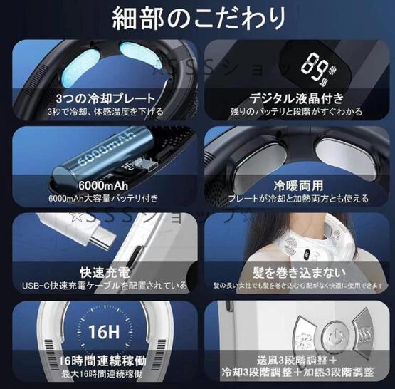【6000mAh進化版節電バッテリー】6000mAh大容量バッテリーを搭載しています。従来の3000mAhモデルよりも60%以上の電池量を持っているため、長時間の使用でも安心して使えます。 3段階の風量調整が可能です。暑い季節や運動中に使用する場合には、風量を最大にして体を涼しく保つことができます。従来のバッテリーに比べて高性能な素材を使用して。