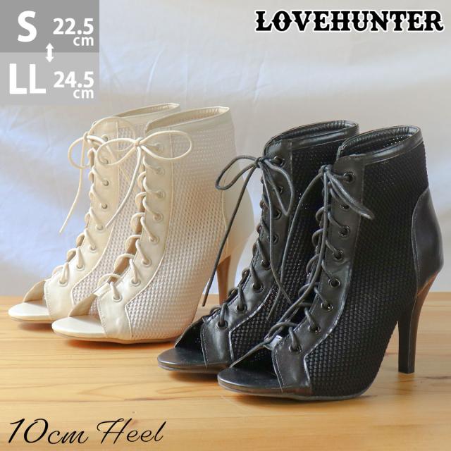 レディース ブーツサンダル 2way レースアップ メッシュ 10.0cmヒール 22.5cm-24.5cm 黒 アイボリー No.1625 LOVEHUNTER ラブハンター