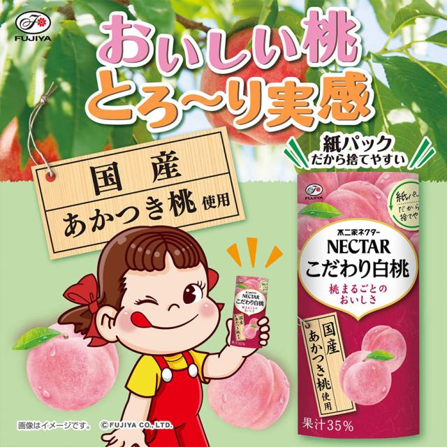 国産「あかつき」を使用(果汁35%)し、熟れた白桃をまるでそのままほおばるような果汁入り飲料。
