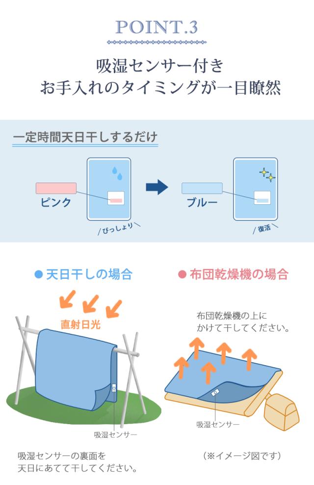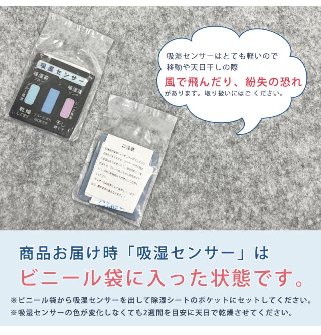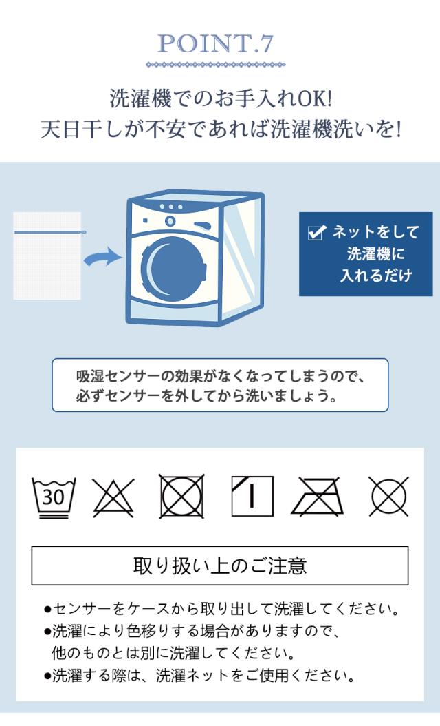※洗濯する際は、洗濯ネットをご使用ください。 ※センサーをケースから取出して洗濯してください。 ※吸湿センサーの色が変化しなくても2週間に一度の目安で、天日・布団乾燥機で乾燥してください。 ※天日に干す場合、センサーの裏面を天日に干してください。 ※天気のよい日でも、湿度の高い時は、センサーがブル—に戻らない場合もありますが、吸湿機能は十分に回復しています。 |