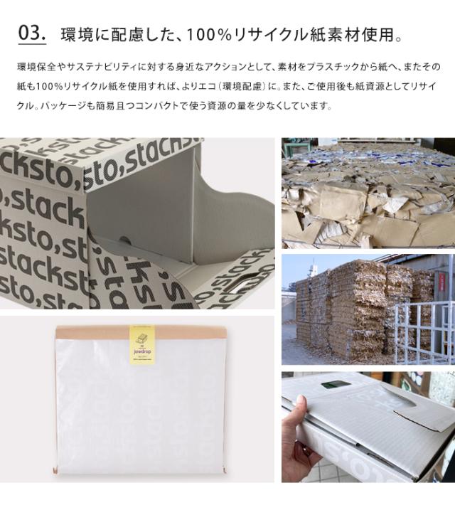 驚いた時の表情「jaw(下あご)がdropping(落下)」に見えることからjawdrop(ジョードロップ)と名付けられた収納ボックス。いちいち箱を持ち上げたり、出したりする必要がなく、前面の取手をつかんで開けられます。ロゴや格子などのシンプルな柄に落ち着いたカラーリングは、お部屋をおしゃれにしてくれます。おもちゃや日用衣類、よく使う食品のストック、細々とした雑貨など、出し入れが多いアイテムの収納から、A4サイズが入るので書類整理にも。環境保全やサステナビリティに対する身近なアクションとして、素材をプラスチックから紙へ、またその紙も100%リサイクル紙を使用すれば、よりエコ(環境配慮)に。また、ご使用後も紙資源としてリサイクル。パッケージも簡易且つコンパクトで使う資源の量を少なくしています。