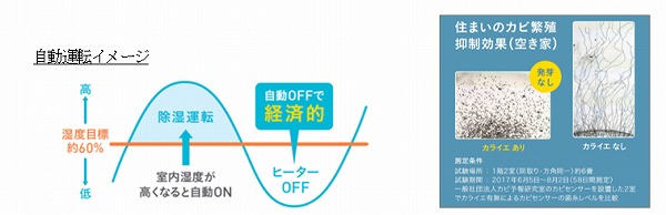 湿度60%を超えると運転し、下回ると停止する自動制御を搭載。