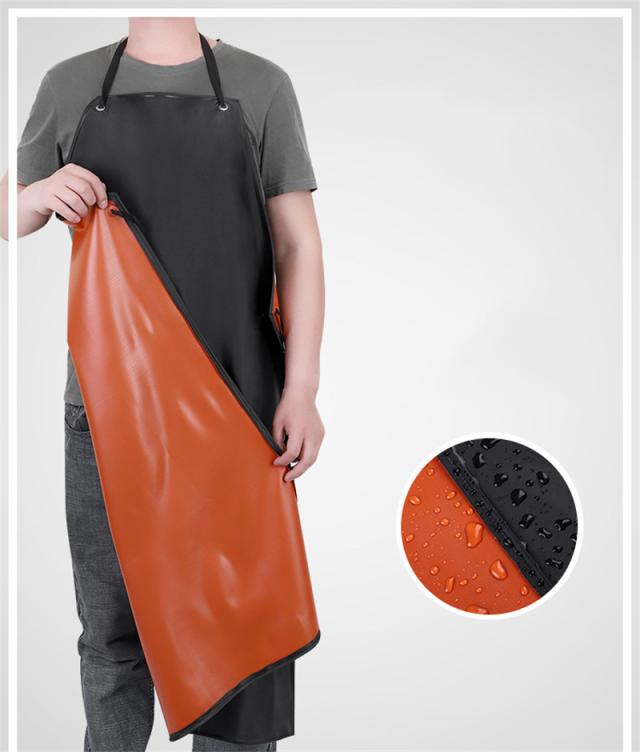耐水性・耐油性のPVC素材のエプロン。食品の汚れや油分から守り、お手入れも簡単です。軽量、撥水効果も高く、どこでも使えるシンプルなデザインのエプロンです。