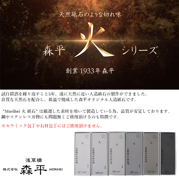 ”Morihei 火 砥石” は厳選した素材を用いて製造している為、品質が安定しており、鋼やステンレス刃物にも問題無くご使用頂けます。
