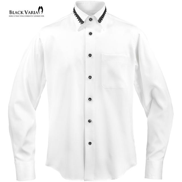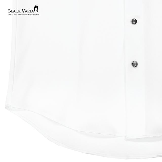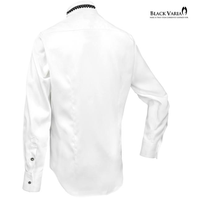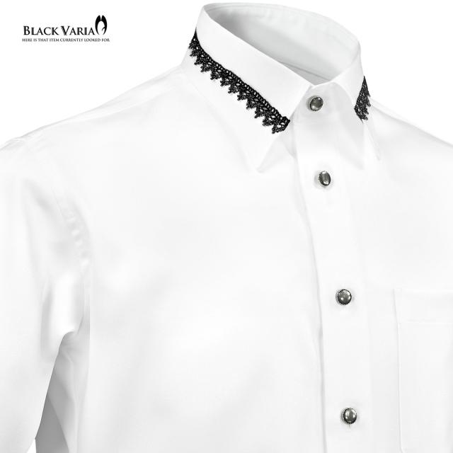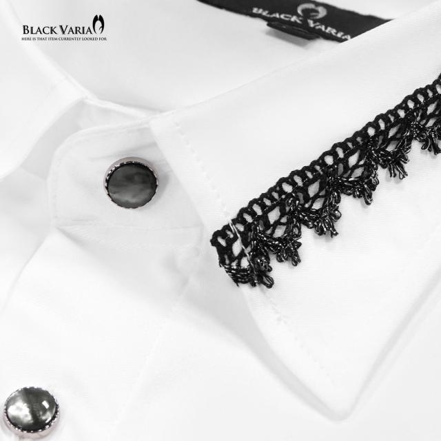 サテンシャツ 襟レース ラインストーンボタン トーションレース ドレスシャツ パウダーサテン メンズ(ブラックレース白シャツ) 21170