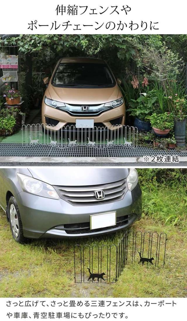 折りたためるアイアンフェンス。猫3連。1枚。カラーは、ブラック(4515085036296:NK120BLK)、ホワイト(4515085036302:NK120WHT)、です。お気に入りのお庭には可愛いフェンスしか置きたくない!置くだけで空間をおしゃれに仕切れる、猫ちゃんデザインのアイアンフェンス。ガーデニング、ガレージ、玄関アプローチ、お庭の間仕切り等に大活躍!家の中でもかわいさ発揮。折り畳み式なので、隙間にシュッと収納できます。●かわいく仕切れますネコちゃんが1、2、3…並んでお散歩してる?可愛い♪ブラックは本物の黒猫ちゃんのような躍動感。上品な雰囲気のホワイトは角度によって猫ちゃんの見え方が変わり、お庭で遊ぶ子猫のようで愛らしい♪●伸縮フェンスやポールチェーンのかわりにさっと広げて、さっと畳める三連フェンスは、カーポートや車庫、青空駐車場にもぴったりです。●立ち入り禁止のやわらかな意思表示に。軽やかなフォルムですので、緑豊かなお庭から、モダンな外構にもおすすめです。●連結OK連結は簡単、はめこむだけ。●スリム収納ワンアクションでたためます。【フェンスで囲む場合のご注意】※蝶番の仕様上、直角(90度)に曲がるのは片側だけになります。1枚のフェンスでは「コ」の字型にはできません。※2枚以上連結すれば、「コ」の字型や四角形を作ることができます。※こちらの商品は(猫3連)1枚となります。
