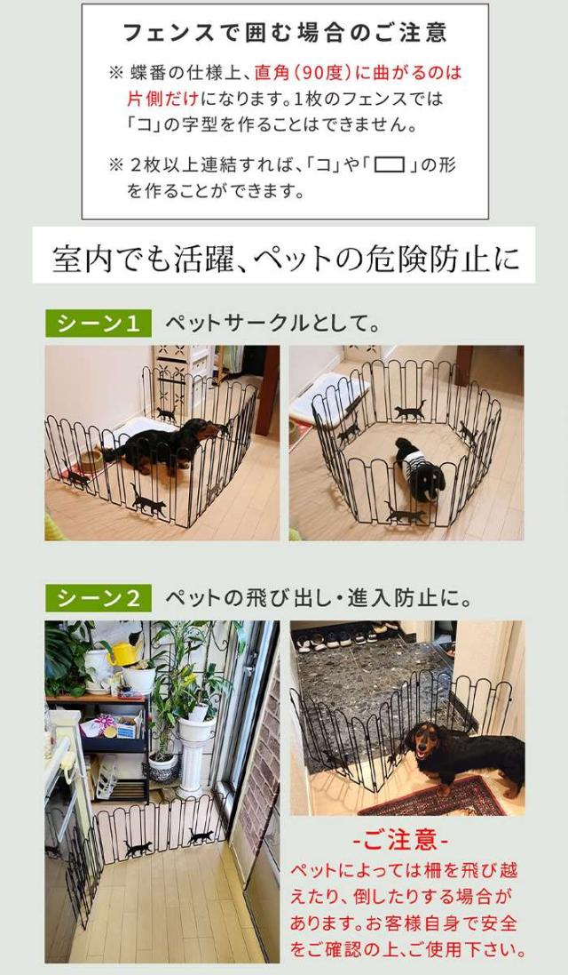 ■ご注意事項:※ 掲載写真は表記サイズと異なる場合がございます。※ 画面上のカラーはご使用ブラウザやモニターの設定により、実物とは若干異なる場合がございます。あらかじめご了承の上、ご注文をお願いいたします。※商品は玄関渡しになります。※コーディネイトで使用している商品は本体には含まれません。※蝶番の仕様上、直角(90度)に曲がるのは片側だけになります。1枚のフェンスでは「コ」の字型にはできません。※2枚以上連結すれば、「コ」の字型や四角形を作ることができます。