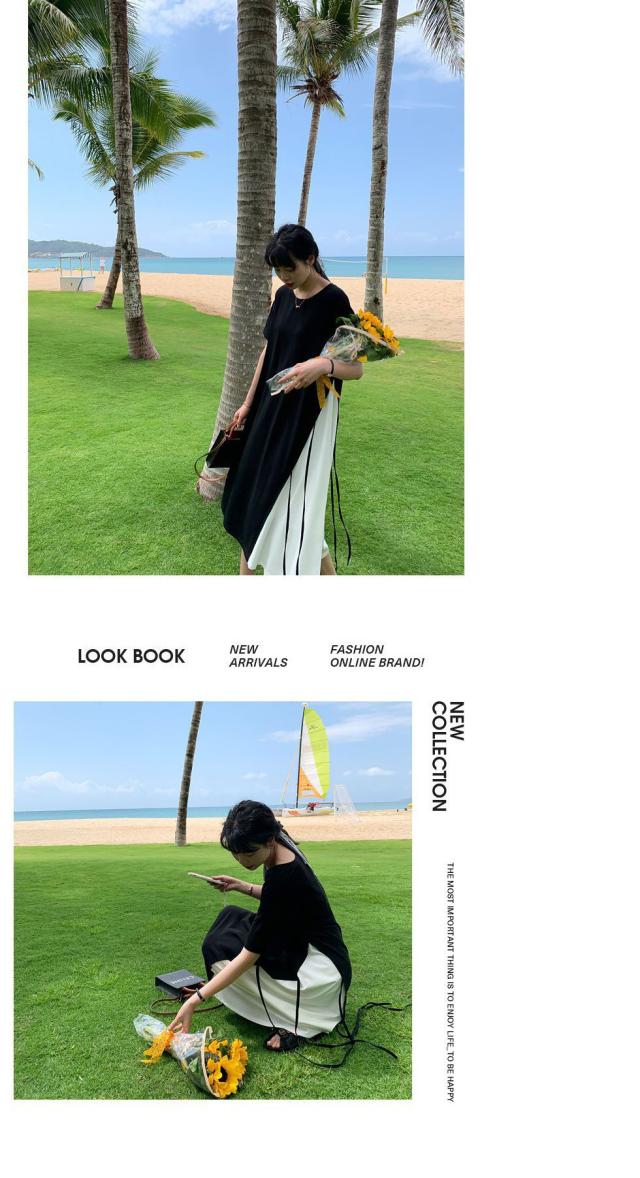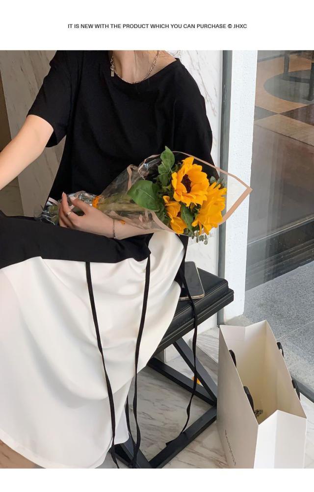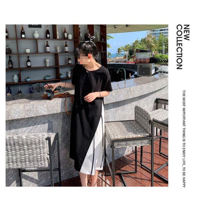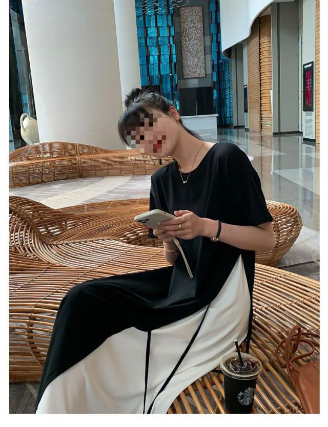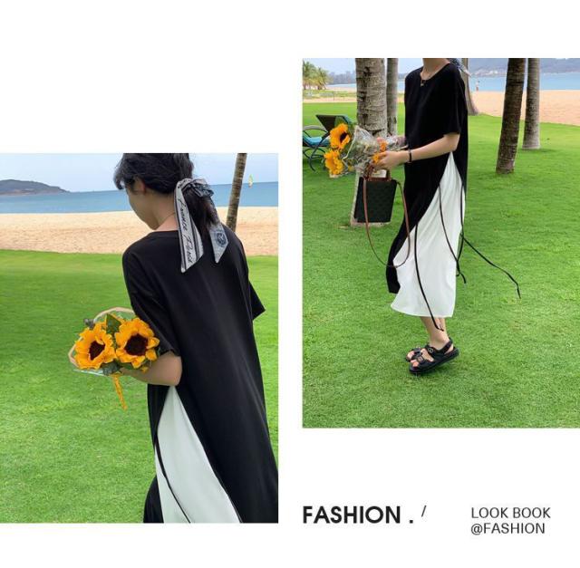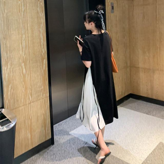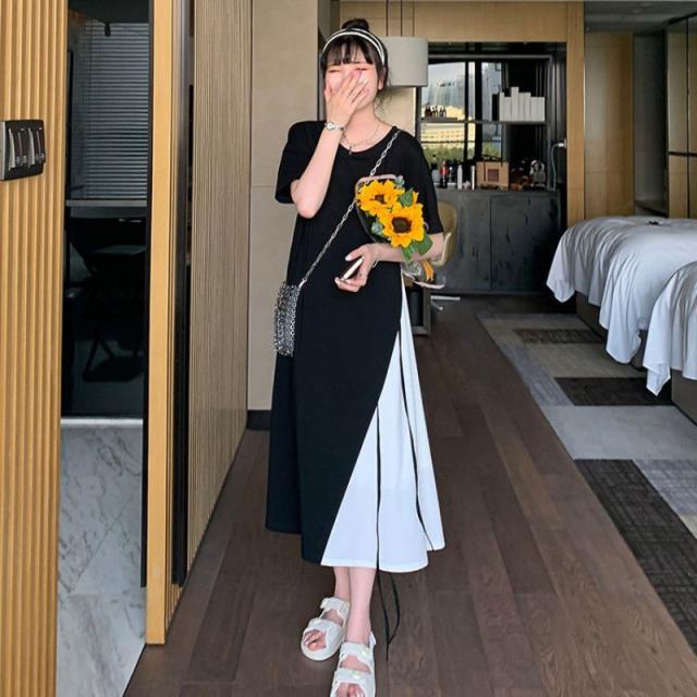 半袖 ロングワンピース レディース 大きいサイズ ワンピース 切り替え フレア ロング丈 ラウンドネック レイヤード風 無地 春 夏 ゆったり 黒 通勤