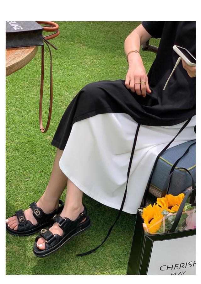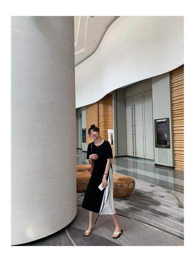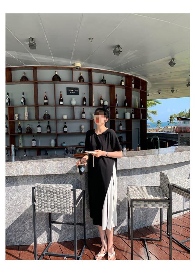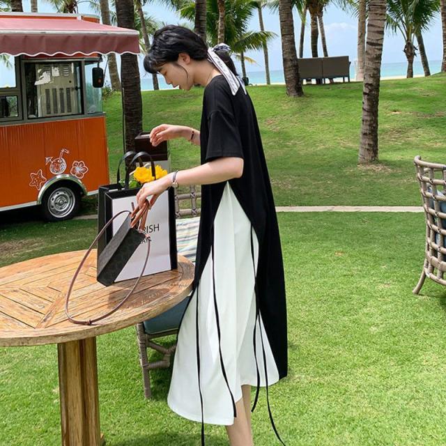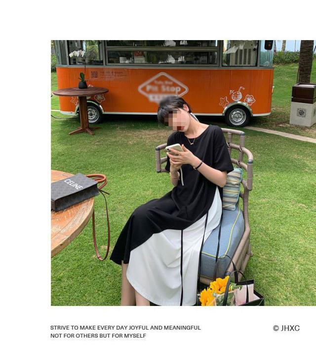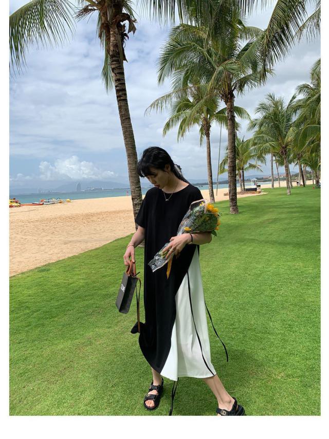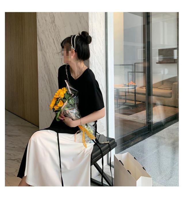 半袖 ロングワンピース レディース 大きいサイズ ワンピース 切り替え フレア ロング丈 ラウンドネック レイヤード風 無地 春 夏 ゆったり 黒 通勤