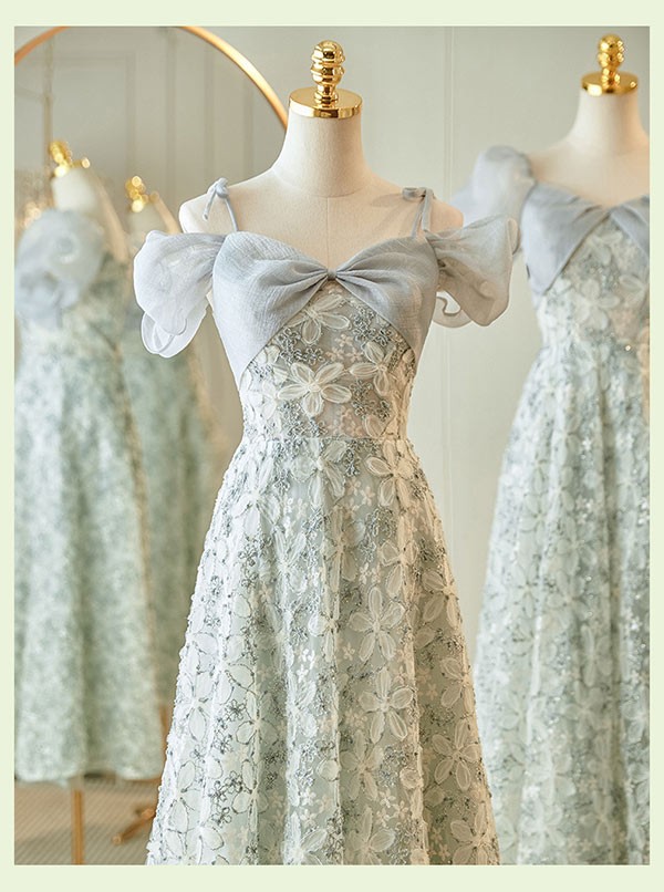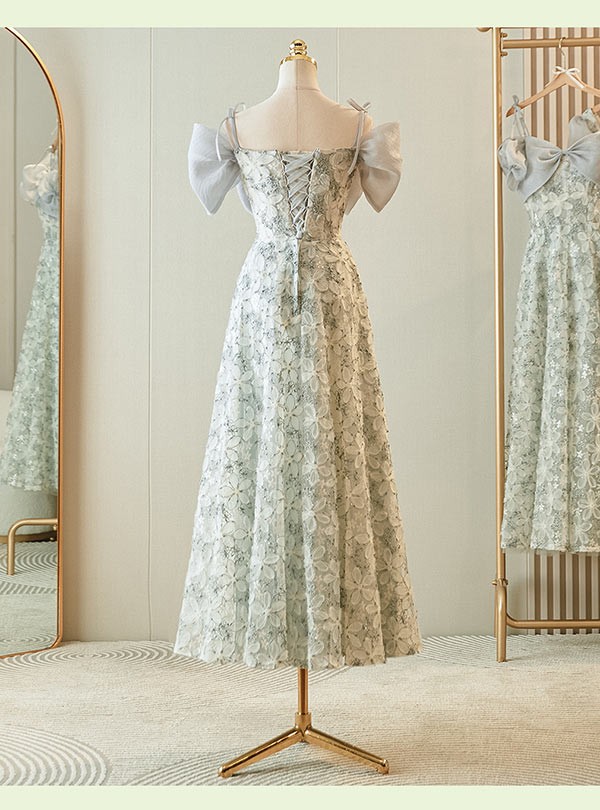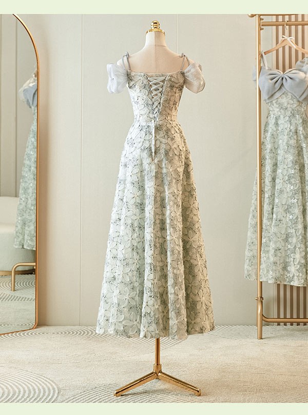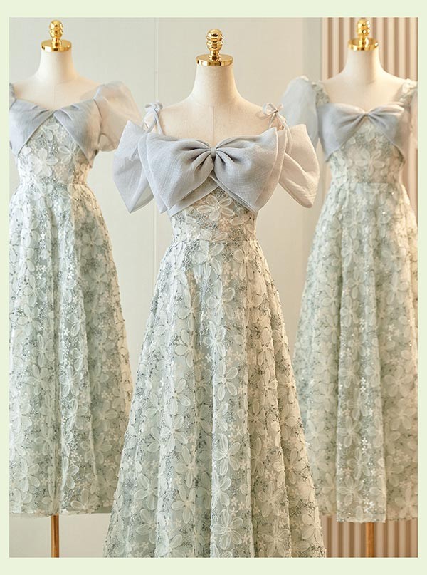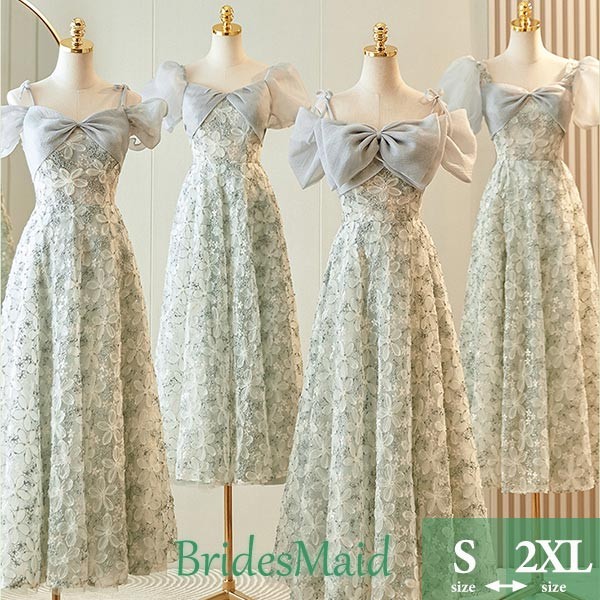 ブライズメイド ドレス ミモレ丈ドレス 総レース 花柄刺繍 ライトグリーン 演奏会 ピアノ発表会 キャミソール バフスリーブ ポワン袖 Aライン ワンピース レディース 編み上げ 袖付き 花嫁付き添い サマー 春夏 きれいめ 小さいサイズ 20代 30代 40代