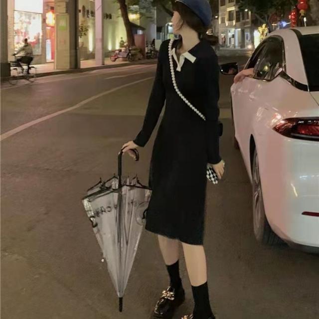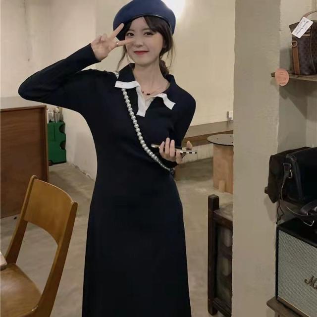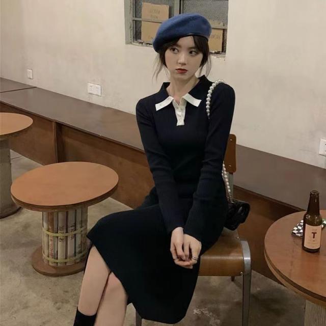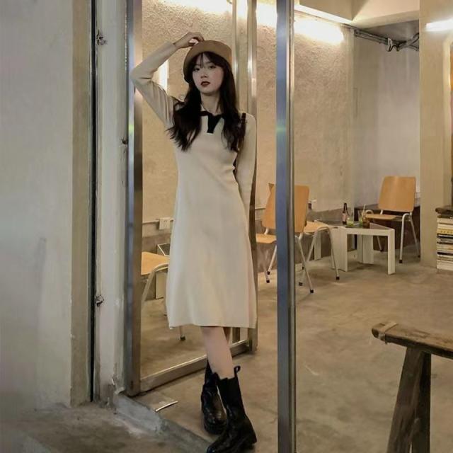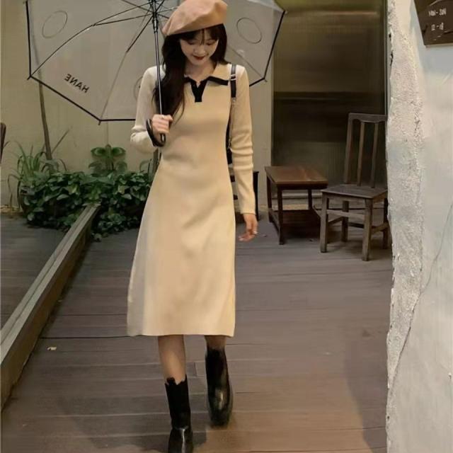 ニットワンピース ワンピース レディース ニット リブニット ロング丈 長袖 秋 冬 折り襟 ロングワンピ aライン 厚手 無地 春 秋冬 きれいめ カジュアル