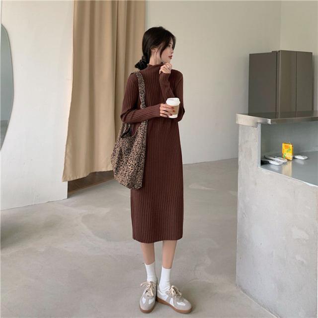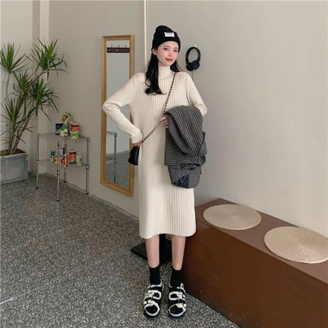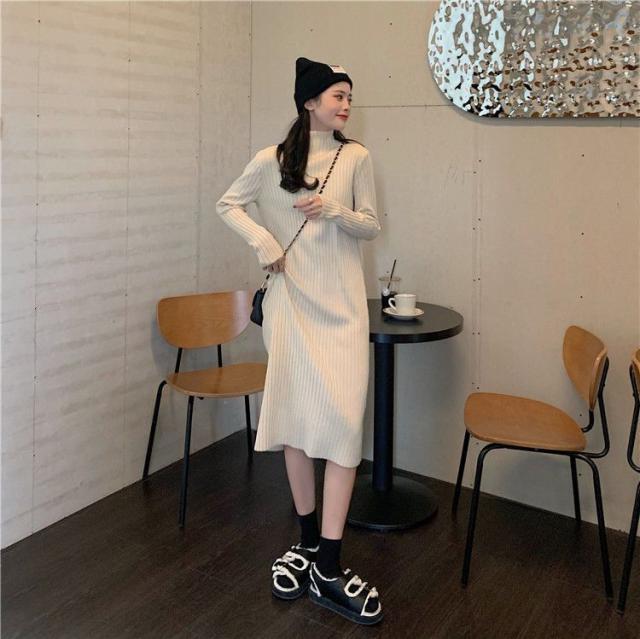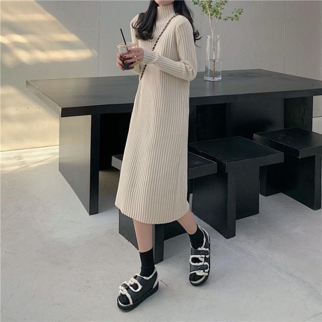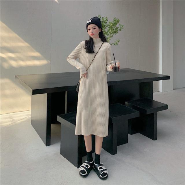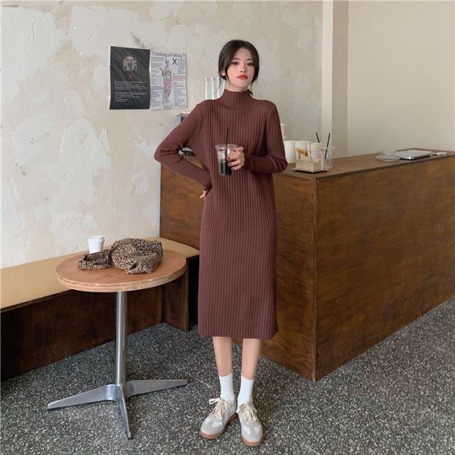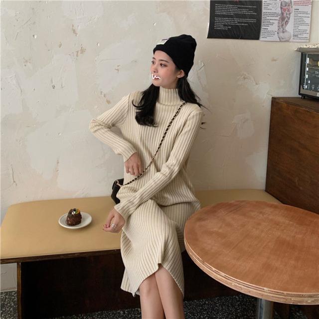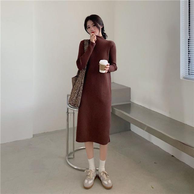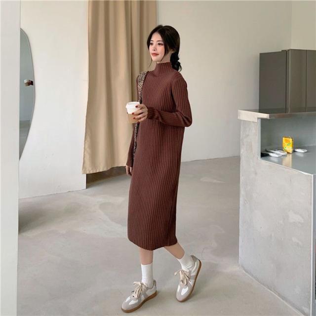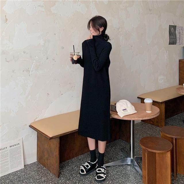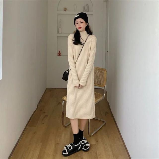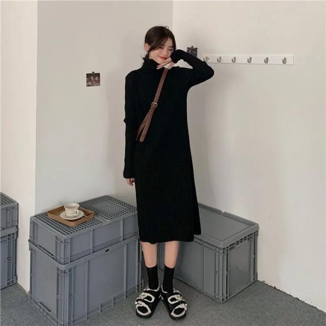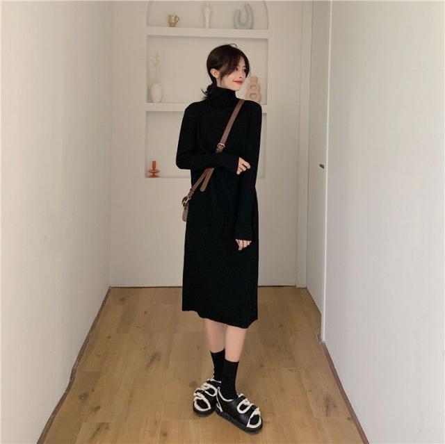 ワンピース ニットワンピース ロングワンピース 秋 冬 レディース ロング丈 ニット タートルネック ハイネック 長袖 リブニット ゆったり 韓国
