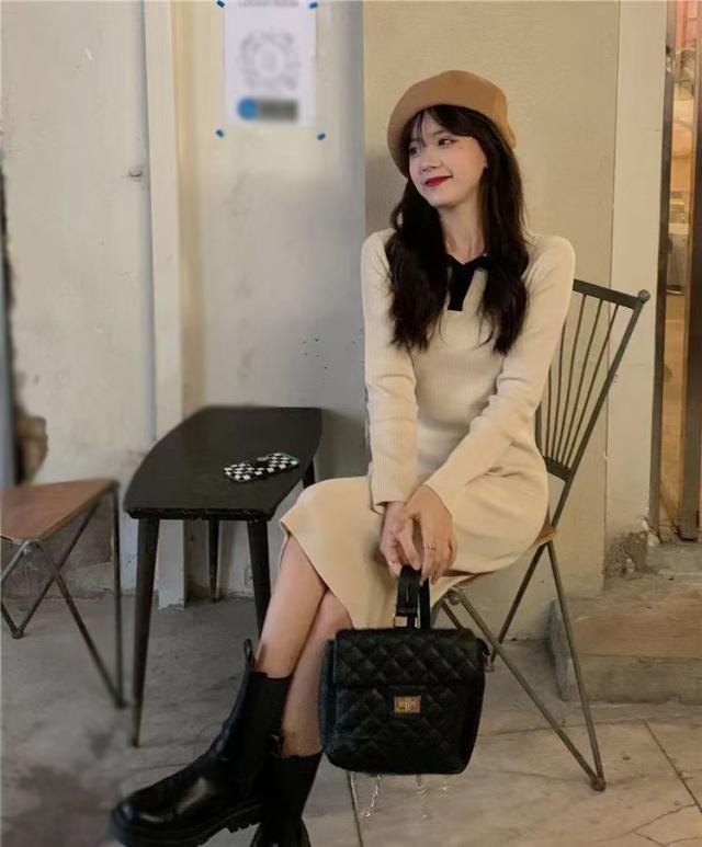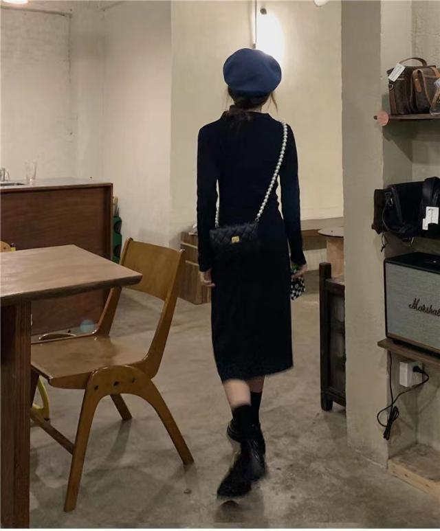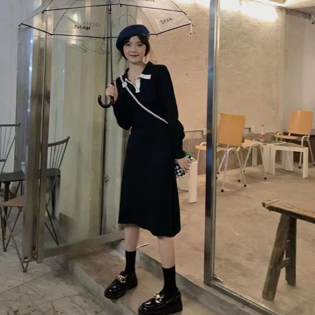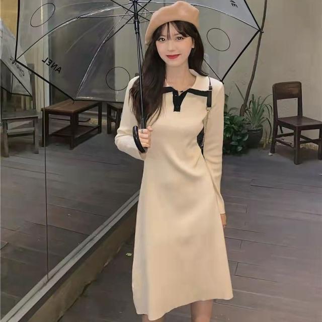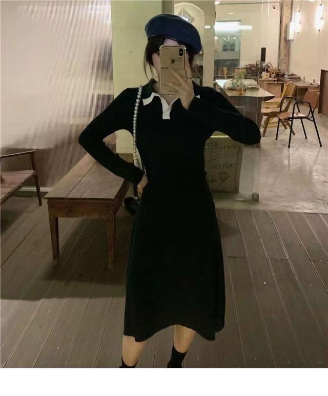 ニットワンピース ワンピース レディース ニット リブニット ロング丈 長袖 秋 冬 折り襟 ロングワンピ aライン 厚手 無地 春 秋冬 きれいめ カジュアル