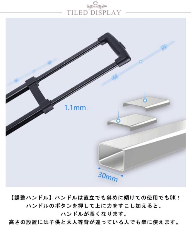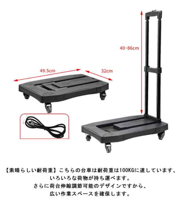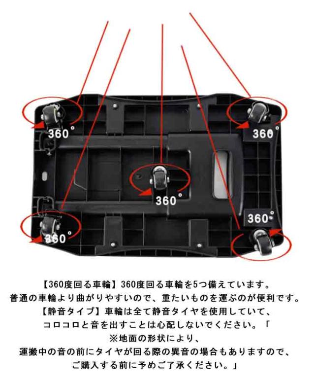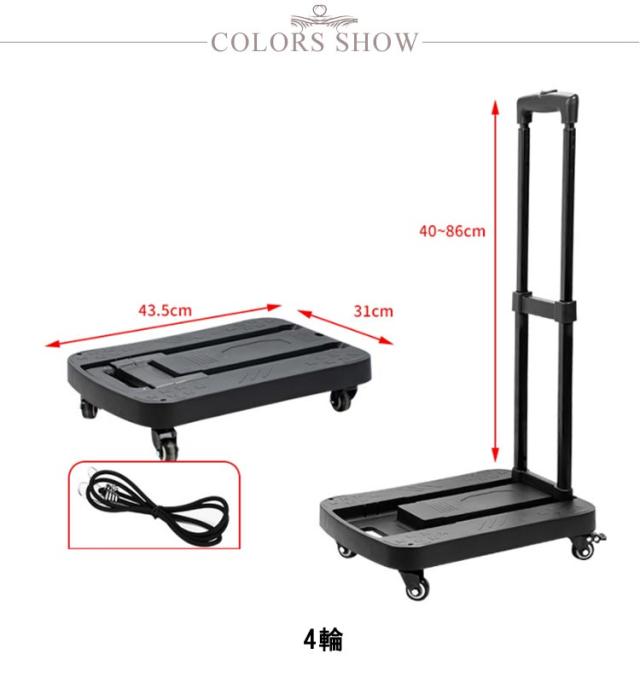 | サイズについての説明 | サイズ:4輪:荷台:43.5*31cm 高さ約40-86cm 耐荷重:75KG 重量:2KG 5輪:荷台:49.5*32cm 展開時:54.2*42cm 高さ約40-86cm 耐荷重:100KG 重量:2.5KG |