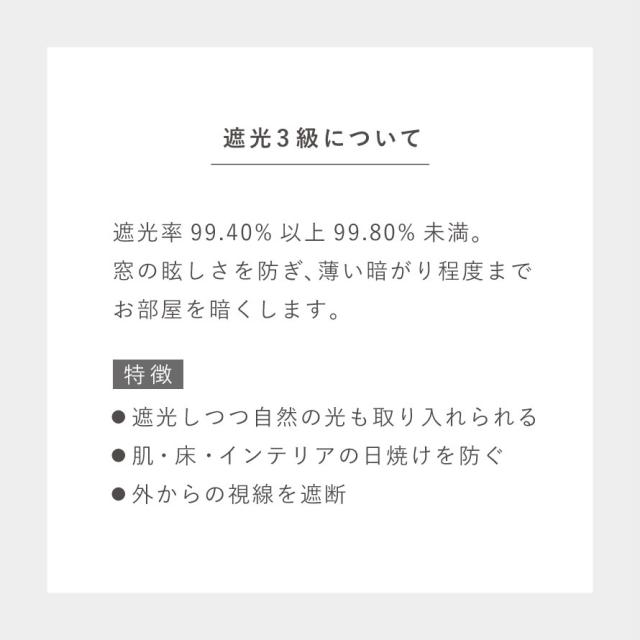 遮光3級(遮光率99.40%以上99.80%未満)で、窓のまぶしさを防ぎ、閉めると薄い暗がり程度までお部屋を暗くします。遮光カーテンとしては効果が低いですが、外からの光を入れ、デザイン重視のカーテンでお部屋のインテリアを楽しみたい方におすすめです。