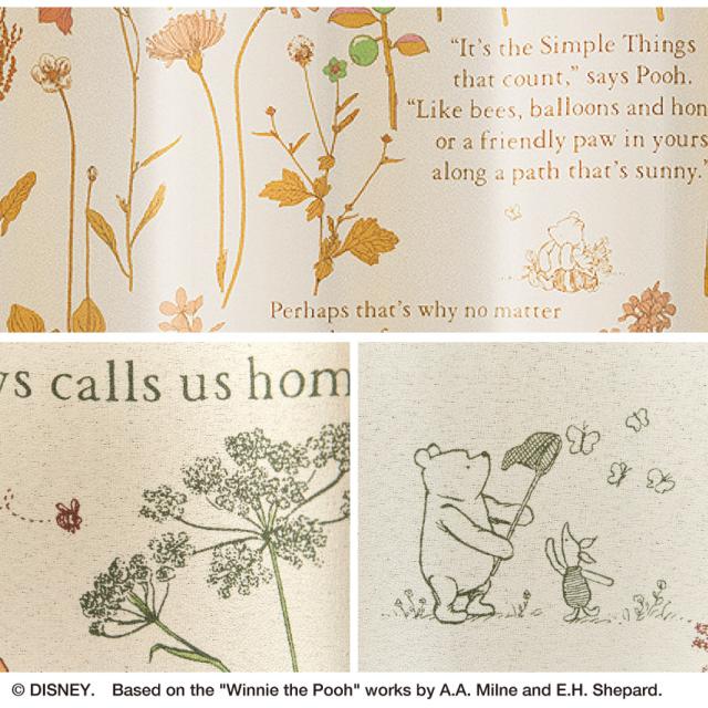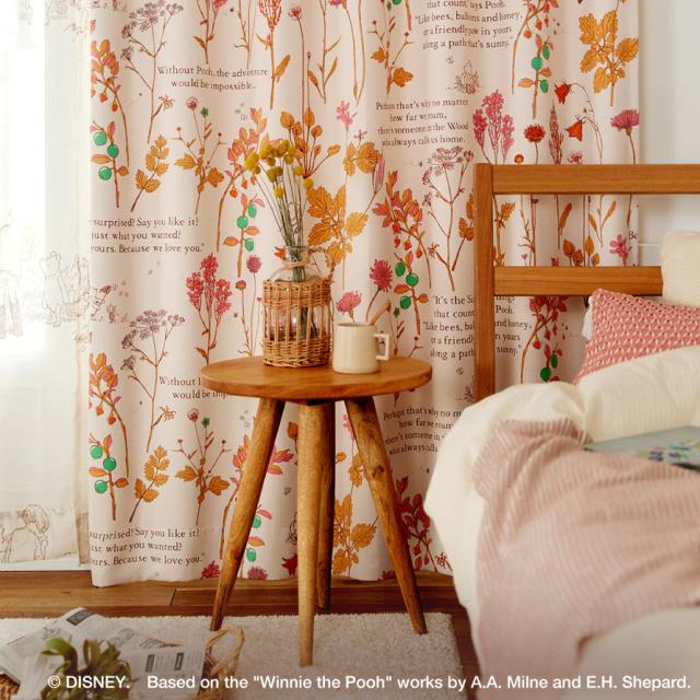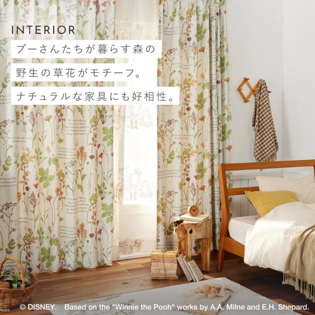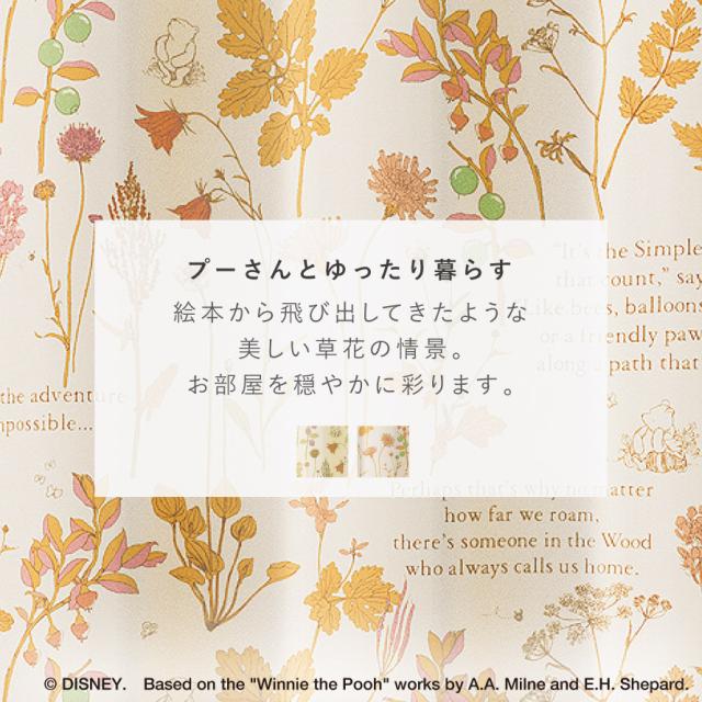 プーさんと野生の花々が穏やかな雰囲気のドレープカーテン。小説の挿絵のようにレイアウトされた草花は、プーさん達が暮らすイギリスの森に生息する植物をモチーフに。