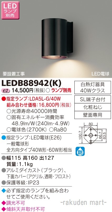 東芝ライテック LEDB88942(K) LEDアウトドアブラケットランプ別売