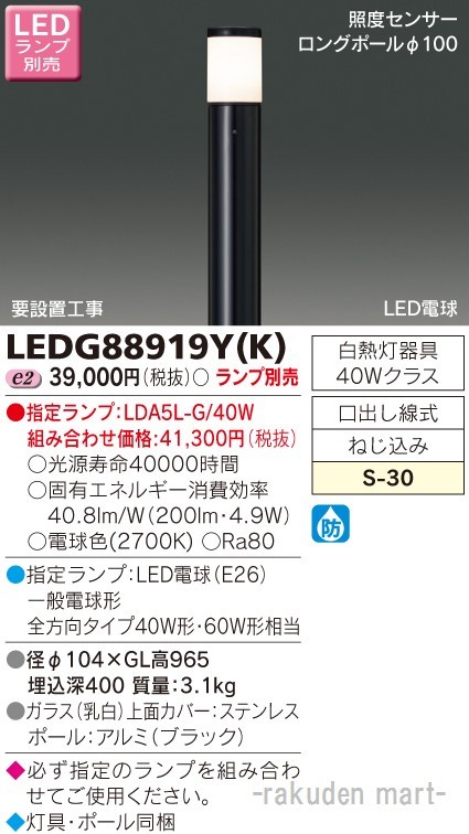 東芝ライテック LEDG88919Y(K) LEDガーデンライト・門柱灯ランプ別 (法人限定)