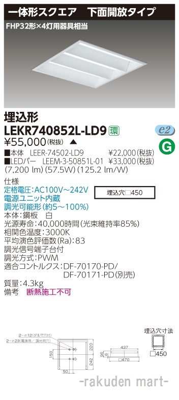 東芝ライテック LEKR740852L-LD9 TENQOOスクエア埋込□450開放