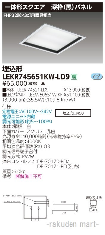 東芝ライテック LEKR745651KW-LD9 ベースライト□450深枠黒W色