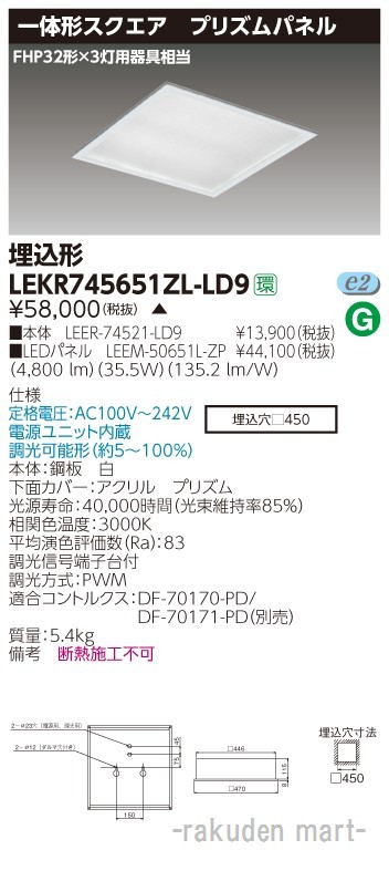 東芝ライテック LEKR745651ZL-LD9 ベースライト□450プリズムL色