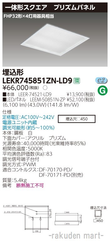 東芝ライテック LEKR745851ZN-LD9 ベースライト□450プリズムN色