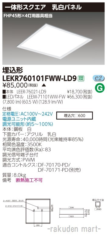 東芝ライテック LEKR760101FWW-LD9 ベースライト埋込□600乳白