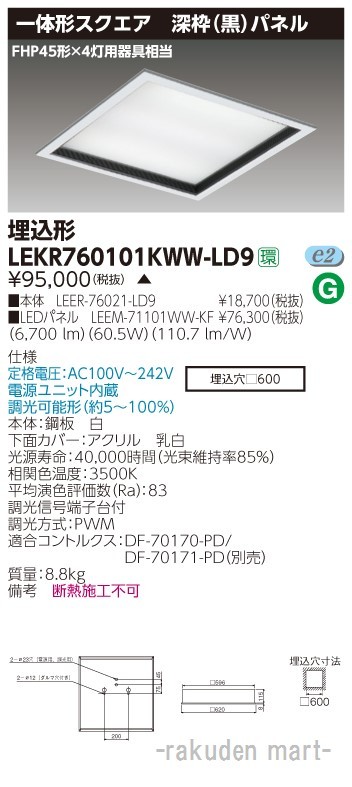 東芝ライテック LEKR760101KWW-LD9 ベースライト□600深枠黒WW色